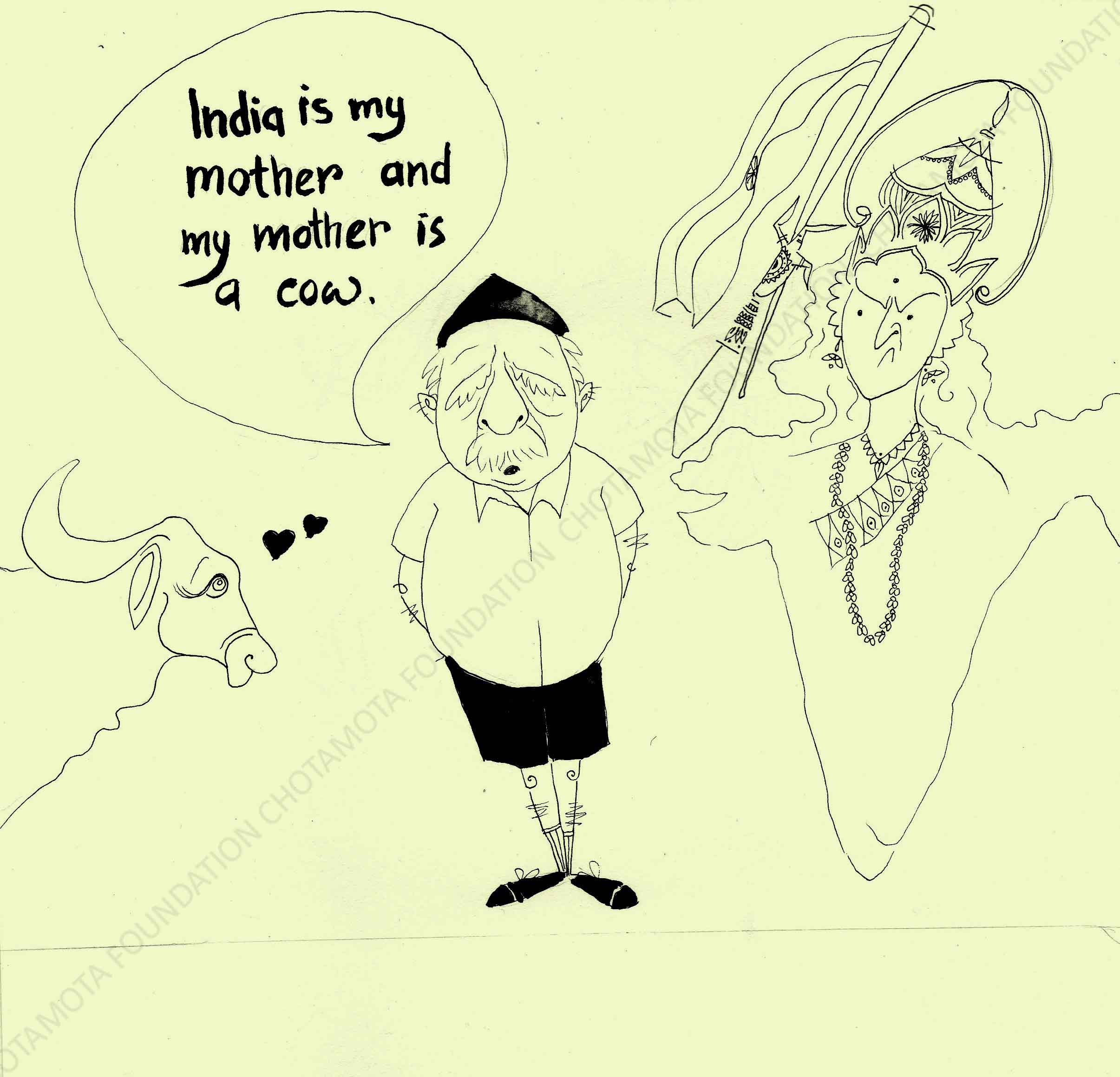Very editorial in its visual shorthand. The logic being verbalized is very indicative of the superstitious confusion in a society where animals are deified- Jury
