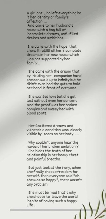 “Great work! A very moving poem on a very important and sensitive topic – it is especially powerful because of its directness in presenting the different aspects of the struggle of the person described. This poem is an attempt to define the seemingly familiar concept of a woman’s unseen agony and emotions. Therony, ‘freedom’ establishes some constrains on this well defined subject by suggesting that feelings are distinguished by various bodily or mental sensations. The satirical ending is very strong and the poem could have been enhanced with a little more detail and a little more emphasis on how the line breaks are chosen, where the verse begins, and so on. It is a good piece but there is always a scope of improvement. The emotions underlying the composition are indeed appreciable, but in terms of uniqueness, the author could have explored more in the realm of imagination to, not just speak about our hurdles, but to how emerge victorious.”– JURY.