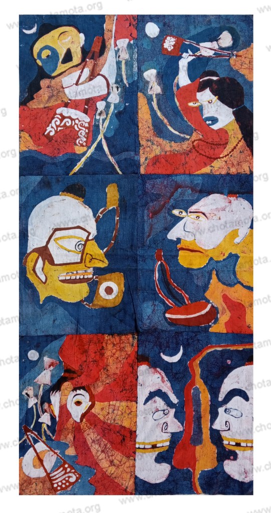 “খুব ভাল বাটিক এর কাজ । Composition খুব সুন্দর । ছবিটা কিছুটা illustration এর মত হলেও খুব ভালো painting . Quirky and unconventional use of the batik medium. Wonderful images, that remind one of Japanese prints.”– JURY.