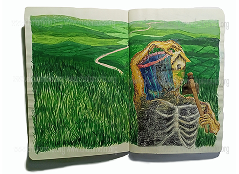 Wonderful work. It is a well designed painting. The brightness of colours and the use of perspective creates a lovely overall effect. The optimism and positivity exuded in presenting the idea deserves appreciation. We expect to see more such work from the artist with enhanced painting/drawing skills as well as application of different symbolism techniques.– JURY on কোদাল / Spade.